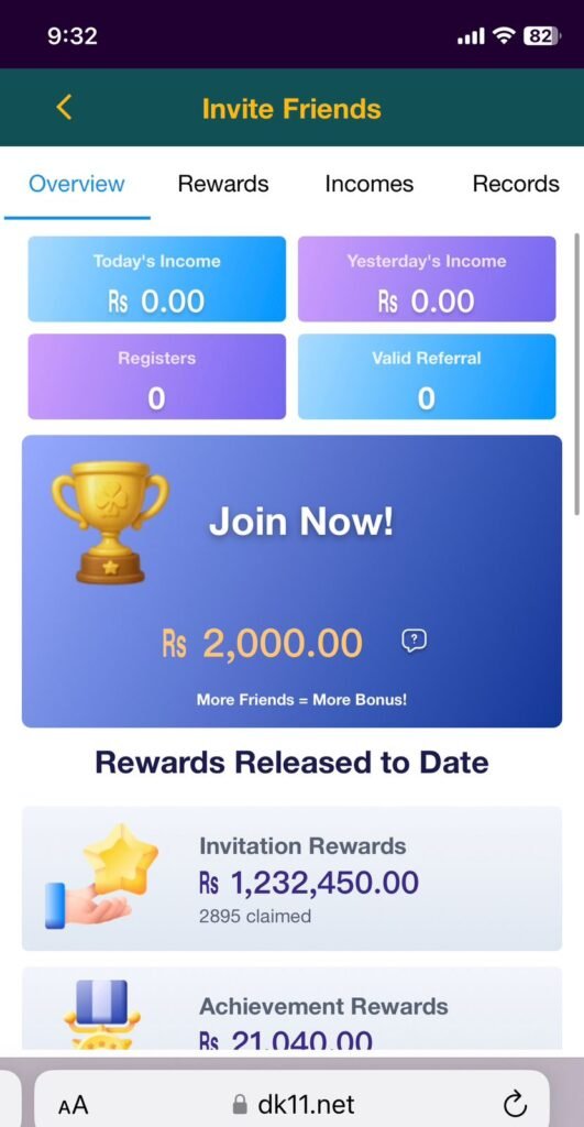 DK11 Game features a referral program where users can earn a 15% lifetime commission by inviting friends. Every new player brought to the platform through your referral link contributes to your passive income. Top partners also enjoy luxury gifts and exclusive event invitations, making this program both fun and profitable.